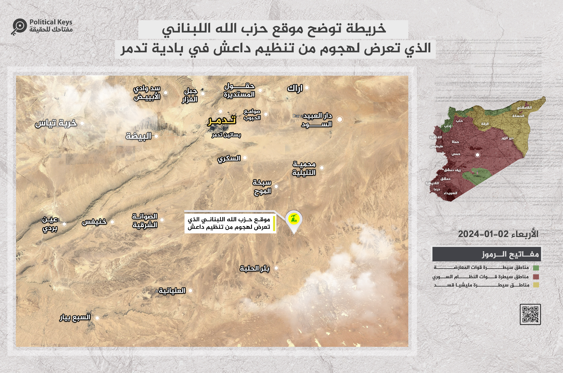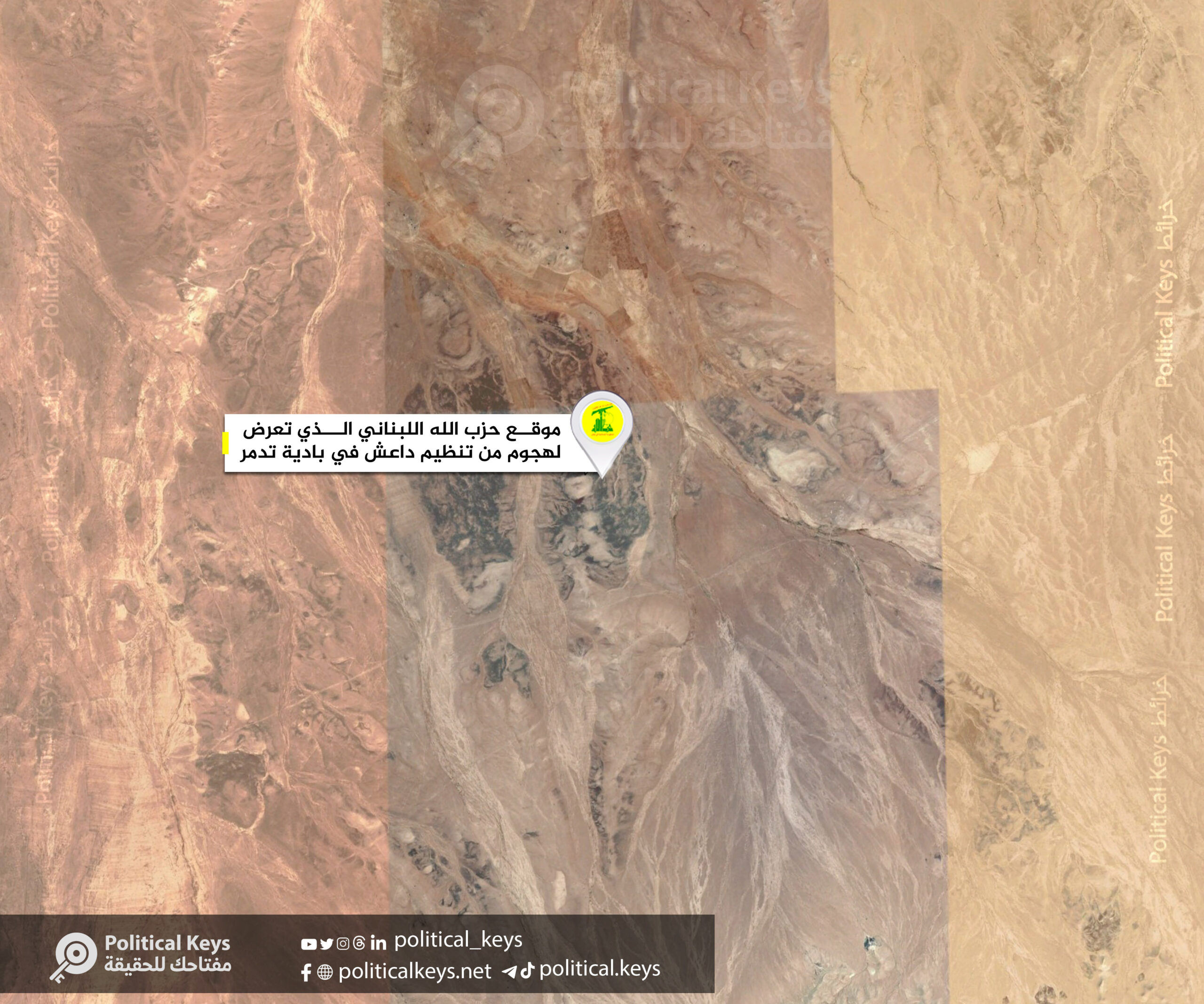 وأعدت «بوليتكال كيز | Political Keys» خريطة توضح موقع حزب الله اللبناني الذي تعرض لهجوم من تنظيم داعش في بادية تدمر: