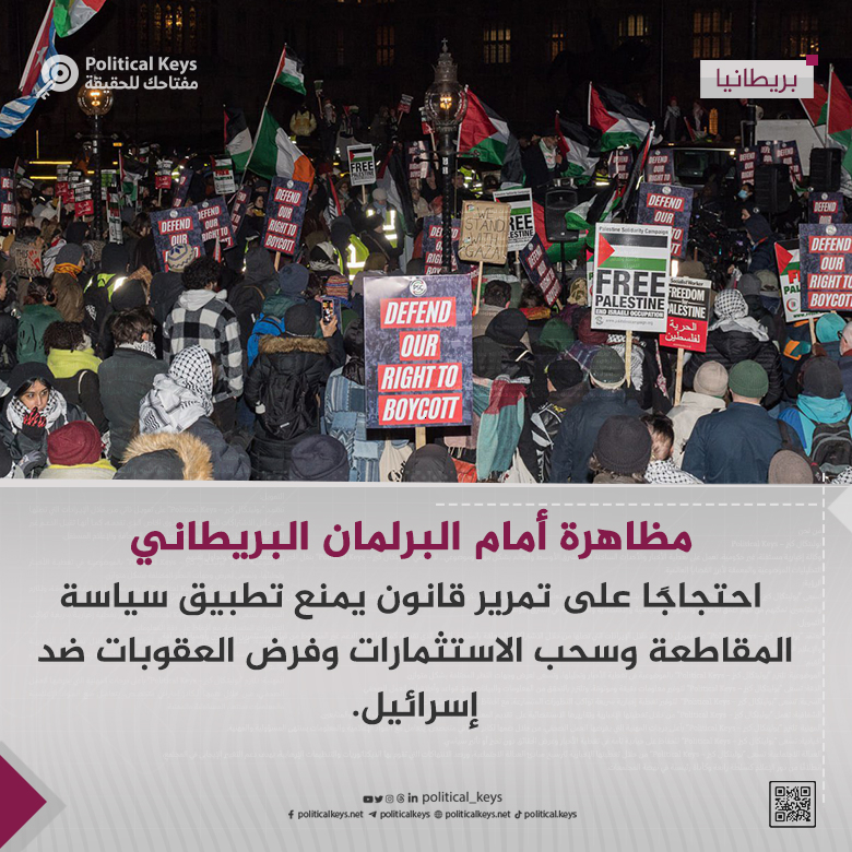 مظاهرة أمام البرلمان البريطاني احتجاجًا على تمرير قانون يمنع تطبيق سياسة المقاطعة وسحب الاستثمارات وفرض العقوبات ضد إسرائيل.