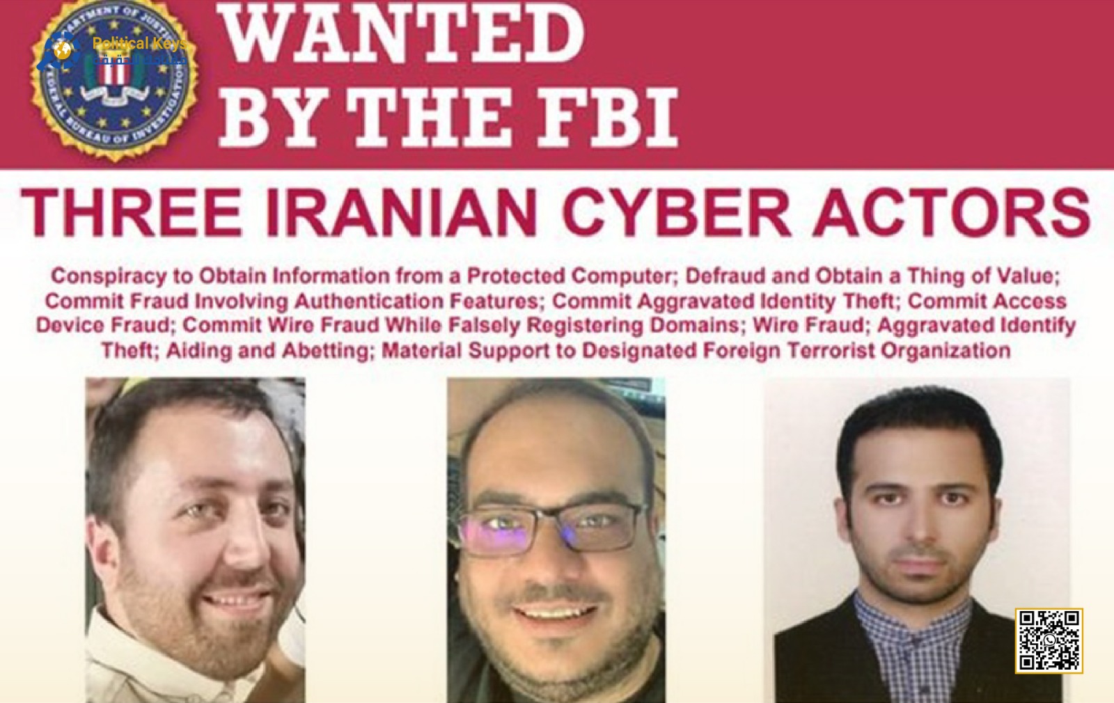 حددت وزارة الخارجية الأميركية القراصنة المطلوبين وهم علي آقاميري، ياسر بلاغي، ومسعود جليلي. وفقًا لمكتب التحقيقات الفيدرالي (FBI)، يواجه هؤلاء تهمًا متعددة تتضمن التآمر لسرقة بيانات من أجهزة محمية، الاحتيال وانتحال الهوية، وتقديم دعم مادي لمنظمات إرهابية أجنبية. وكانت محكمة في العاصمة واشنطن قد أصدرت مذكرات توقيف بحقهم في أيلول/ سبتمبر 2024.