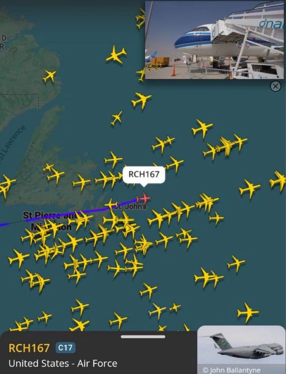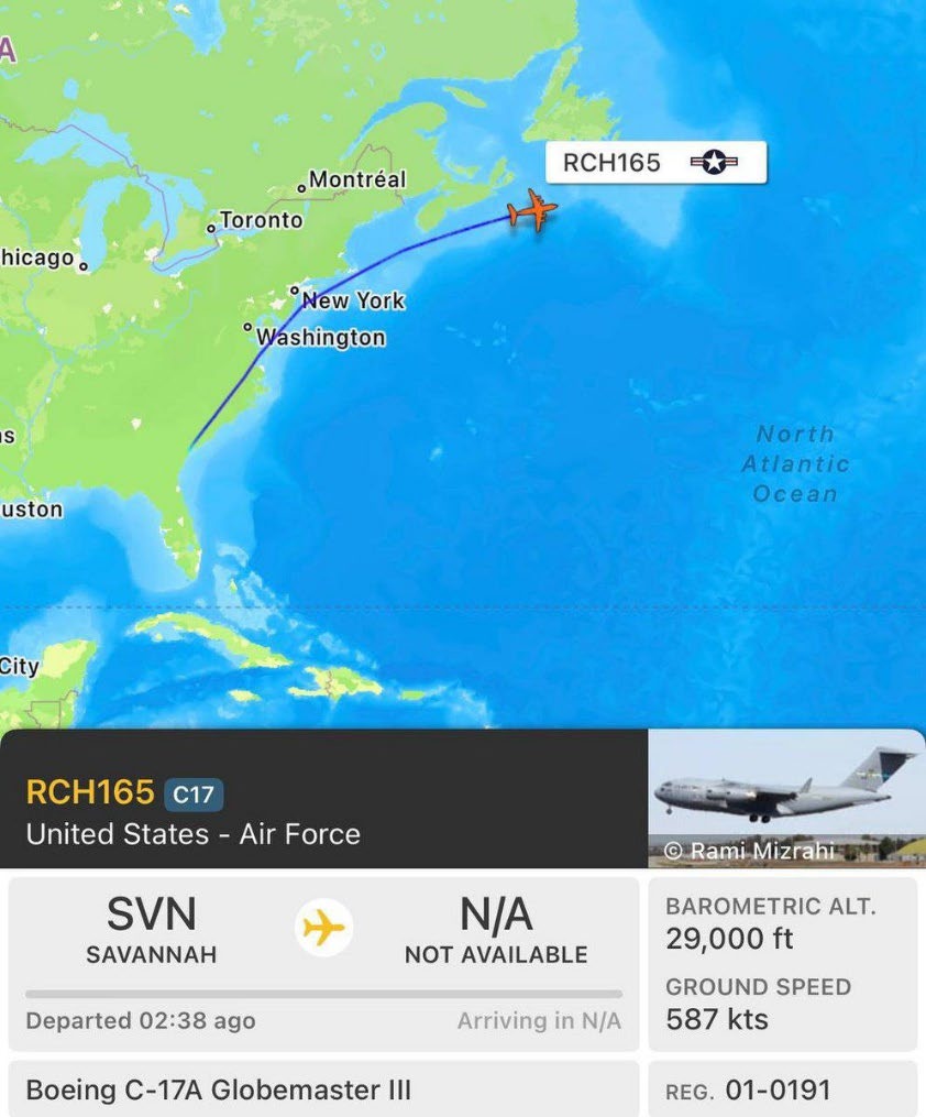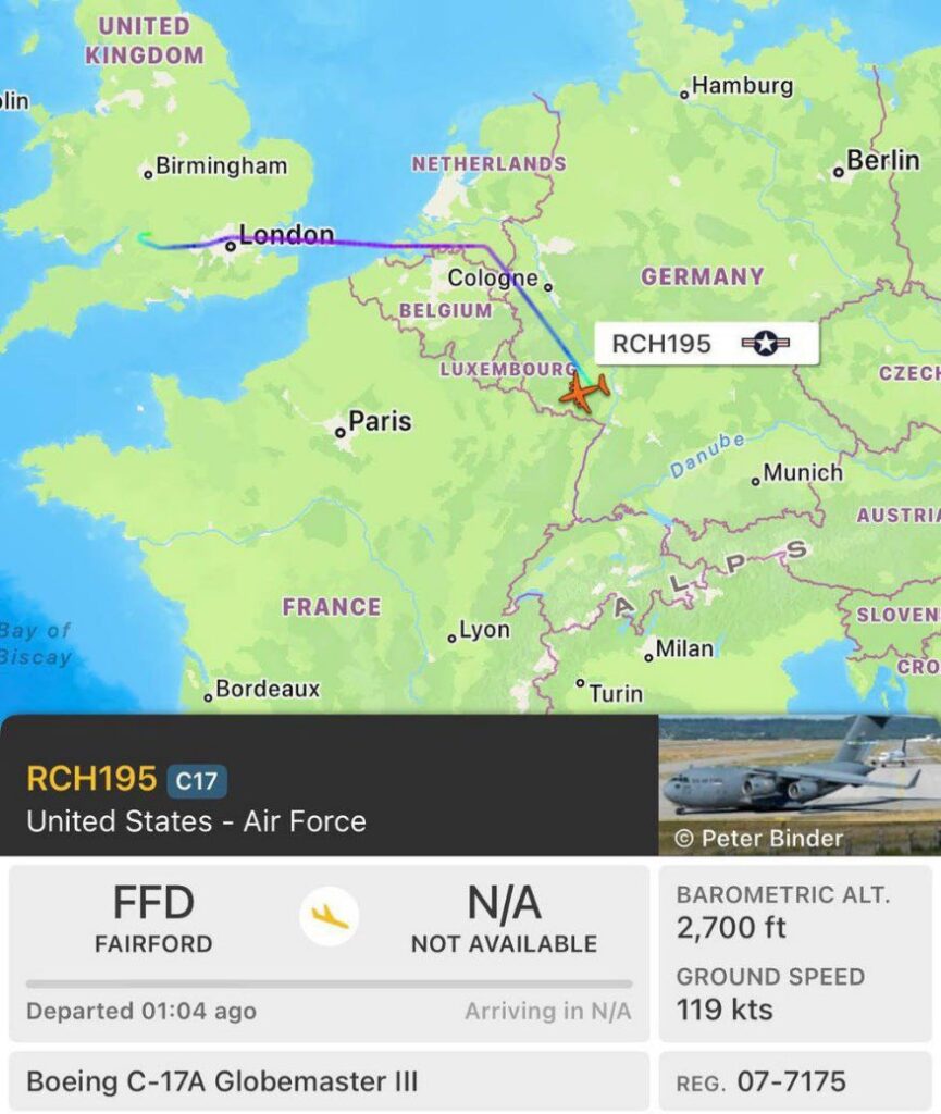 ووفق المعطيات الميدانية، حطّت 10 طائرات C-17 في قواعد بريطانية خلال أقل من 12 ساعة، بالتزامن مع نشاط جوي موازٍ شمل طائرات تزويد بالوقود من طراز KC-135 وKC-46، إضافة إلى مقاتلات F-22 وF-35.