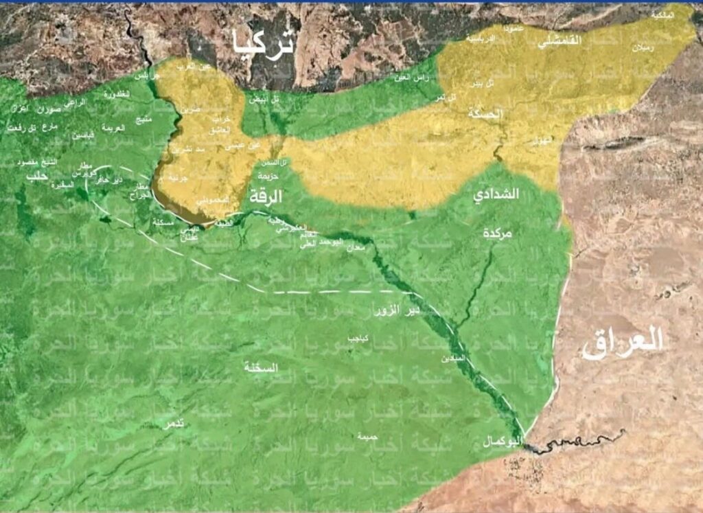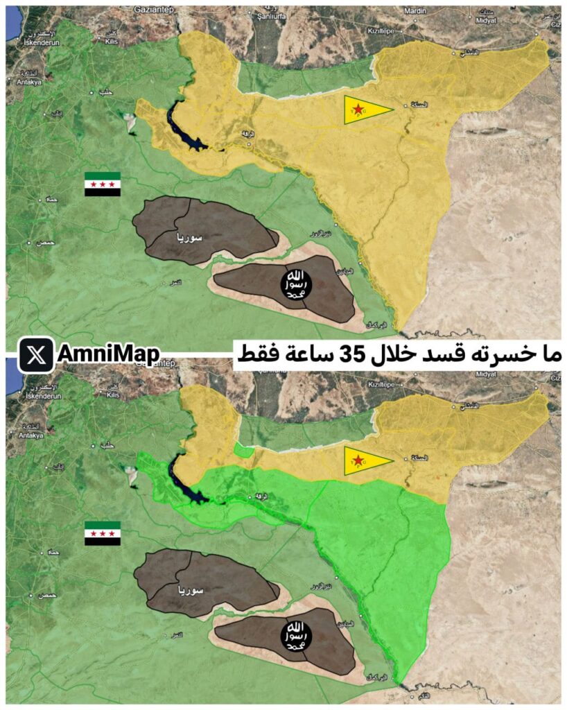 - انسحاب قسد من غرب الفرات وتسليم المناطق (الرقة، دير الزور، معظم الحسكة) إدارياً وعسكرياً للحكومة.